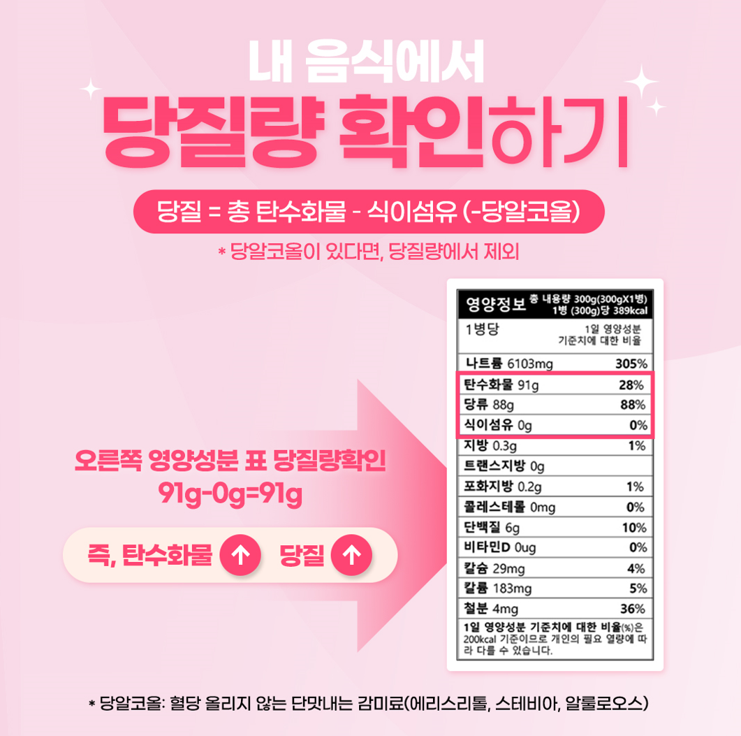 요리할때는 설탕보다 양파나 파 등 재료 자체의 단맛을 활용하고, 제품을 구매할땐 영양정보표를 확인해서 당류도 확인해보세요! 당류만 낮다고 안심은 금물! 탄수화물 - (식이섬유+대체당)이 바로 몸에 흡수되는 당질인데, 이 당질도 함께 낮아야한답니다!