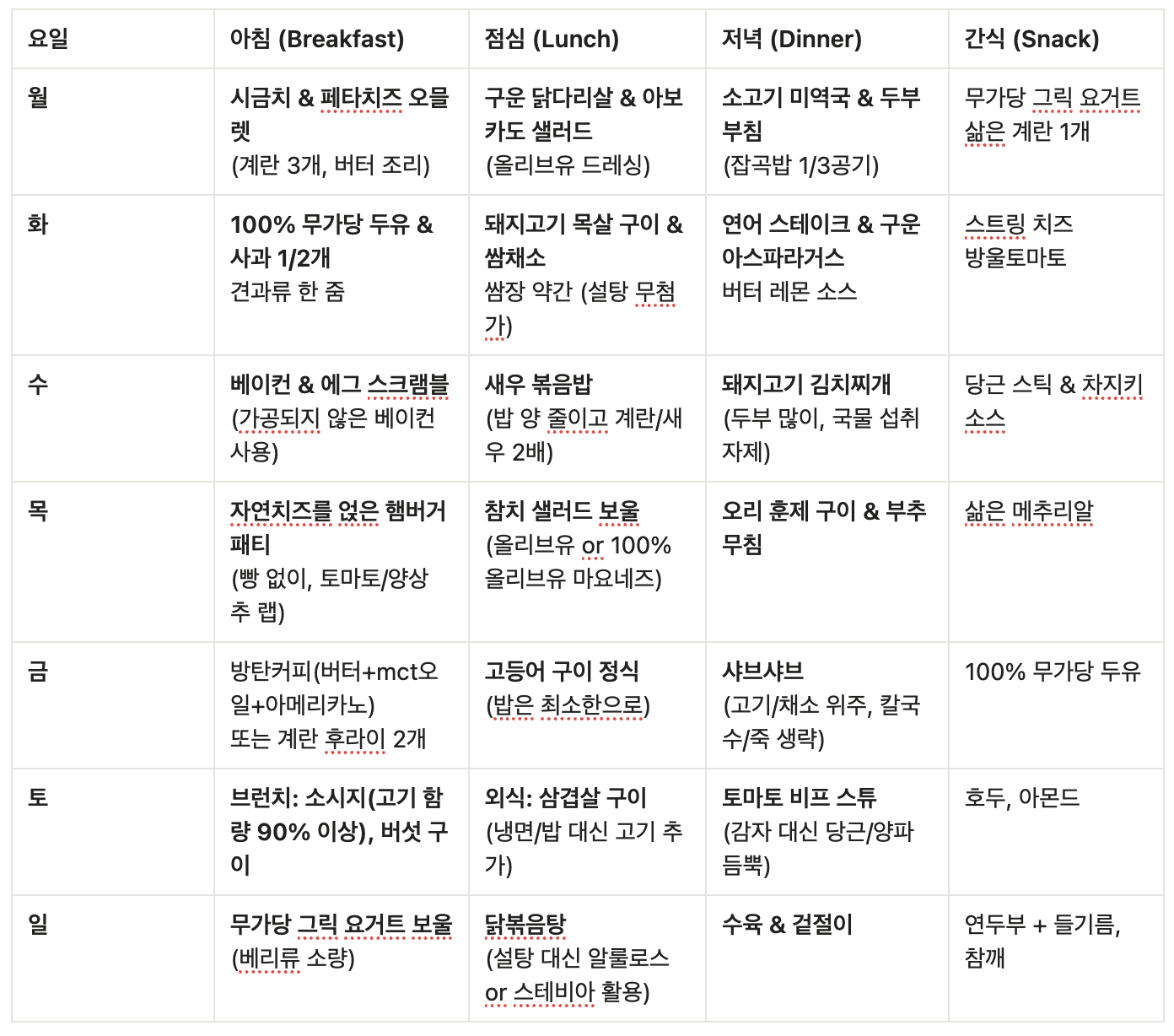 밥, 빵, 면은 주식이 아닌 사이드로 최소화 했고, 요리 시 건강한 지방인 버터, 올리브유, 동물성 기름(라드 등)을 충분히 사용하여 맛과 포만감을 모두 잡았어요! 매 끼니 동물성 단백질(육류, 해산물, 계란)이 메인 요리가 되도록 구성했답니다.